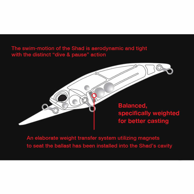 This lure is equipped with an innovative magnet-fixed center-of-gravity system. A well-balanced body shape allows a sizable 5.6 mm steel ball to travel the full length of the lureshifting forward to the head during swimming for a smooth, controlled dive, and then moving to the tail end during casting to ensure a stable, wobble-free presentation.
